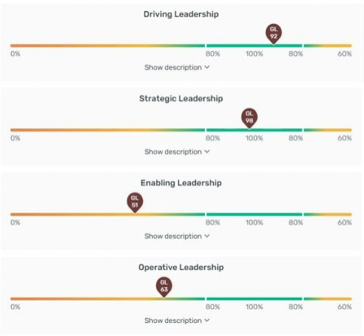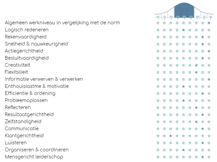 Alle competentie scores worden weergegeven op een schaal van 1 tot en met 9. Achter deze score opbouw gaat de normaal verdeling schuil. Het absolute gemiddelde van de normgroep HBO ligt op 5. Scores van 4 of 6 liggen tegen het gemiddelde aan. 54% van alle scores van respondenten binnen een bepaalde normgroep liggen in dit gebied.